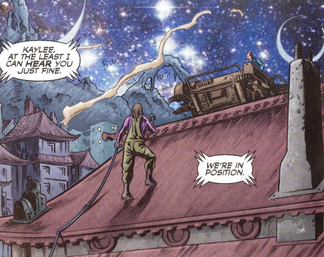 screen shows Mal in his usual brown outfit, not the Xpresscargo coveralls he's wearing for the current heist.