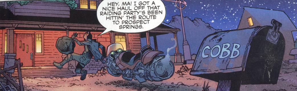 On page 23, notice that the three windows on the front door of the Cobb homestead change their diagonal direction from the closed door in panel 3 and the open door in panel 4. Whoops.
