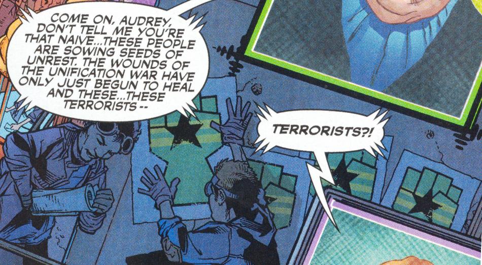 On page 3, panel 1, notice that a couple of men are hanging posters of a stylized fist bearing the slightly altered markings of the flag of the Independent Planets during the Unification War.