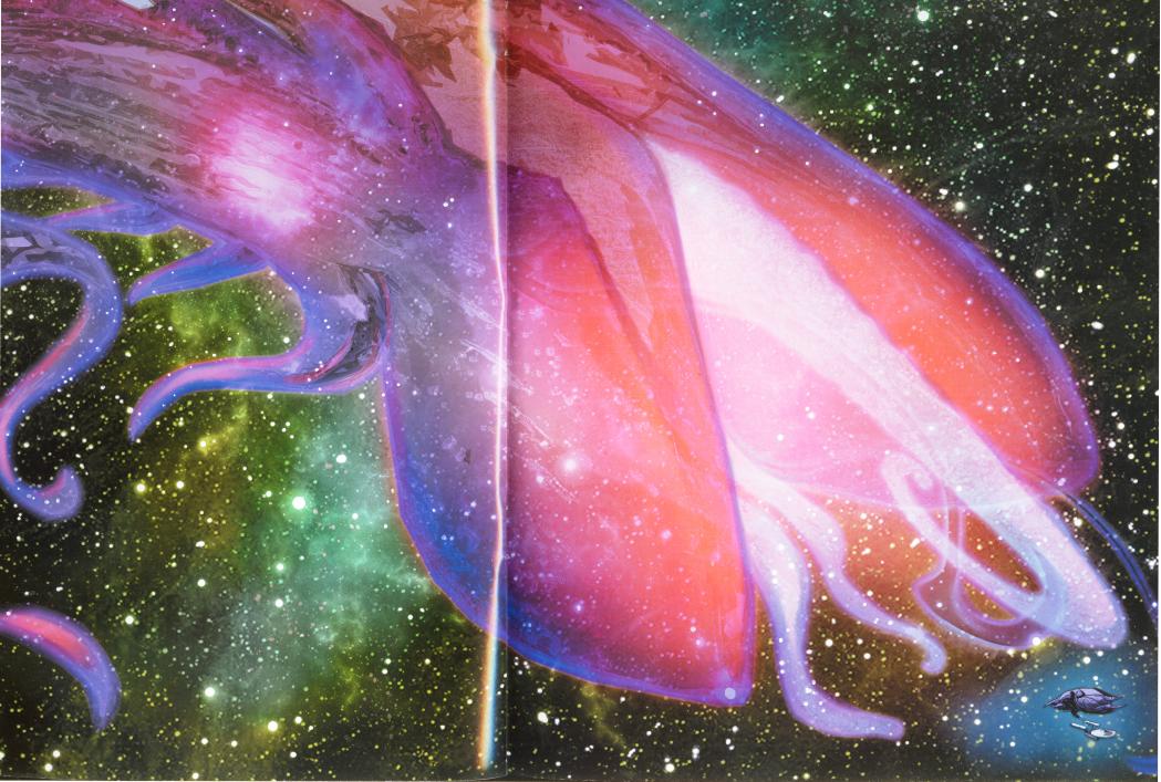 In its introductory two-page splash, the gigantic star-eater organism is so large you can almost miss the tiny Enterprise and alien ship in the bottom right corner! A cool image.
