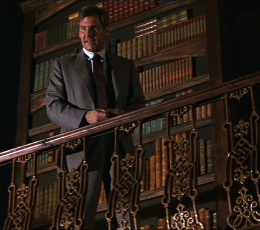 As he escapes through the office window, notice that Indy tucks