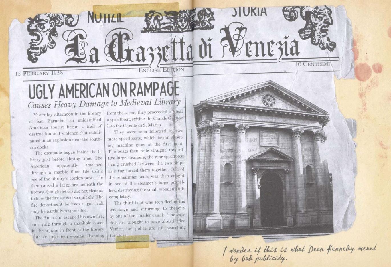 Indy tapes in a portion (again somehow miniaturized) of the front page of La Gazzetta di Venezia newspaper (English Edition) of February 12, 1938. It describes Indy's reckless binge of destruction in the city (though he remains unidentified except as an American). "La Gazzetta di Venezia" is Italian for "The Venice Gazette". The paper's price is 10 centisimi (10 cents).