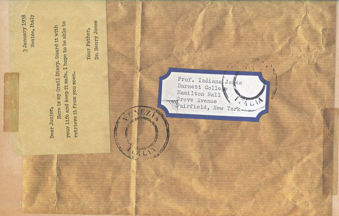 On the facing page of the journal from where the article page is taped, Indy has also taped in a short letter from his father that informs the reader Henry sent the article pages to his son for perusal. Henry remarks that he finds himself with a good deal of time on his hands now that the whereabouts of the Grail are known and he is considering taking an editorial position with his colleagues at the Princeton Review. He also includes a P.S. stating the he enjoyed their adventures together.
