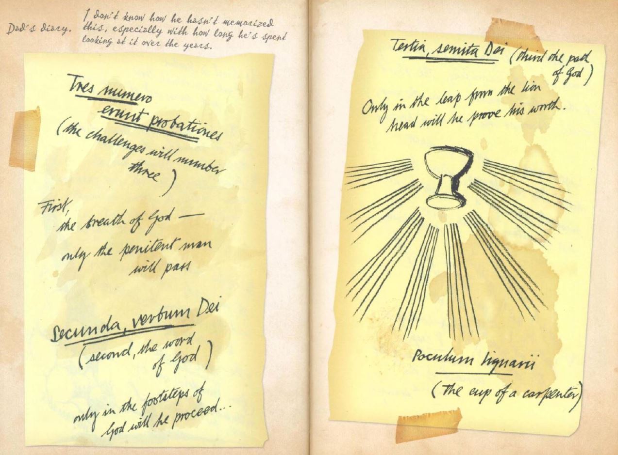 The three challenges Indy has stolen two pages from his father's Grail Diary and taped them into his own journal! They are the pages on which his father wrote the three challenges that face those who seek the Grail. Henry, Sr. has also drawn a sketch of the Grail cup on one of the pages, calling it "the cup of a carpenter"...so no wonder Indy knew exactly which cup to select in the knight's chamber!