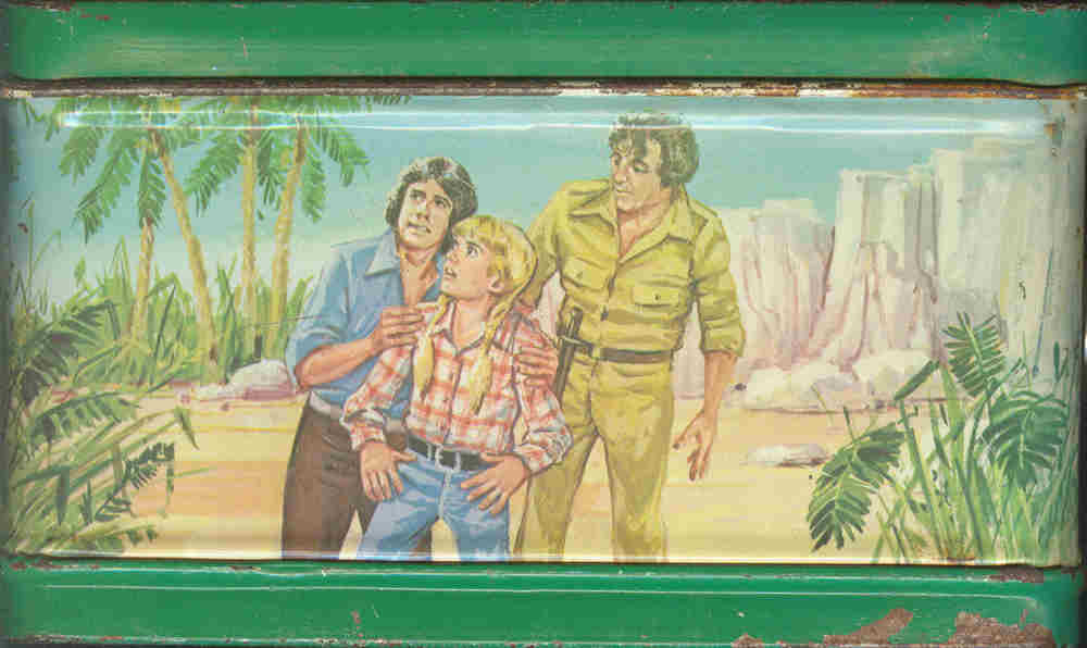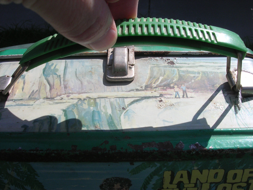 Land of the Lost Lunchbox Panels I've noticed that while there are a number of photos of the large, main panels of the classic metal lunchbox of LOTL70 available on the web, the images on the sides are not to be found. So, I finally scanned all six sides of the one in my possession (obtained at the San Diego Comic-Con some years ago). I don't have the thermos yet though! The images can be found below. Click on the thumbnails to see larger image. Enjoy! By the way, anyone know who painted the images for the lunchbox? I think they did a pretty nifty job...though the Sleestak look kinda funky! And why no Grumpy? He's only the main dinosaur of the show! Instead we get Alice twice.